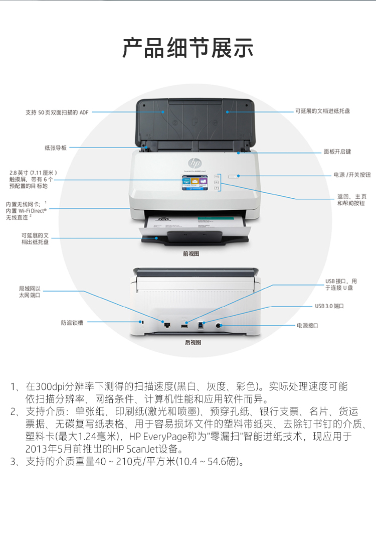 惠普(HP) N4000 snw1 馈纸式A4高速高清自动双面无线WIFI有线网络触摸屏U盘可脱机扫描仪